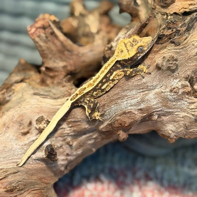 Stunning high white harlequin crested gecko featuring a dark base with bold cream dorsal striping and heavy lateral patterning. Excellent contrast and coverage with partial pinstriping.